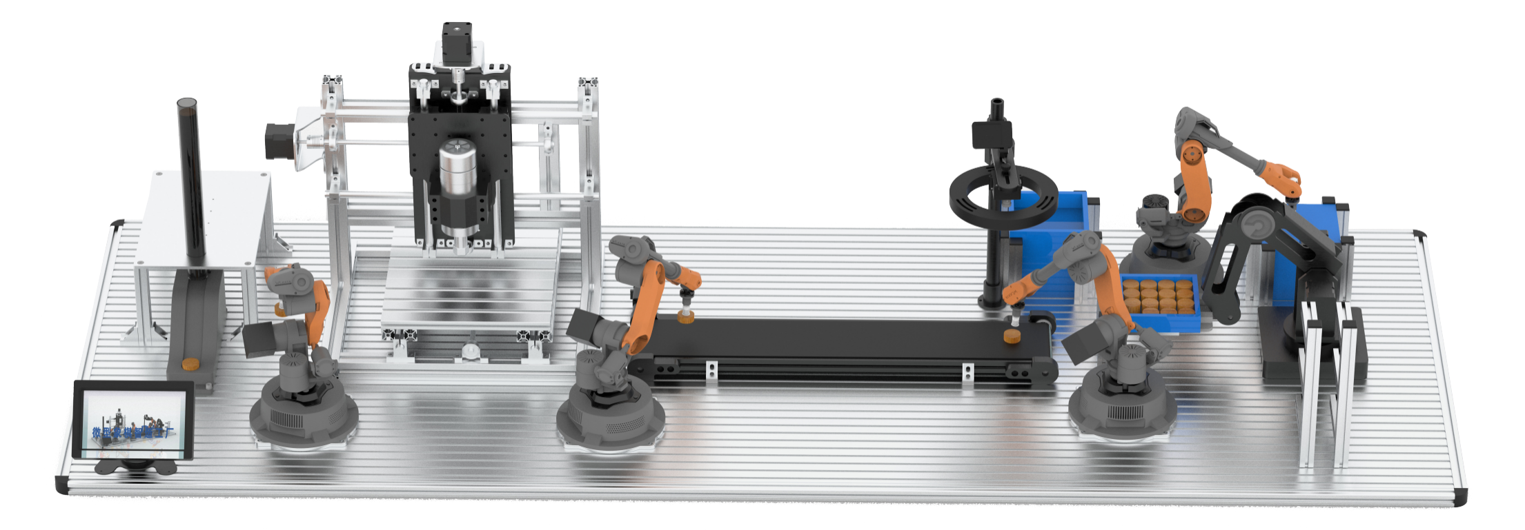 2、★產(chǎn)線包含由產(chǎn)線狀態(tài)顯示單元、電機(jī)驅(qū)動的自動化原料釋放單元,激光雕刻生產(chǎn)單元,傳送帶運(yùn)輸單元,視覺檢測單元、兩套六軸機(jī)械臂組成的成品單元及一套桌面碼垛機(jī)械臂組成的倉儲單元,產(chǎn)線急停按鈕及狀態(tài)指示燈。